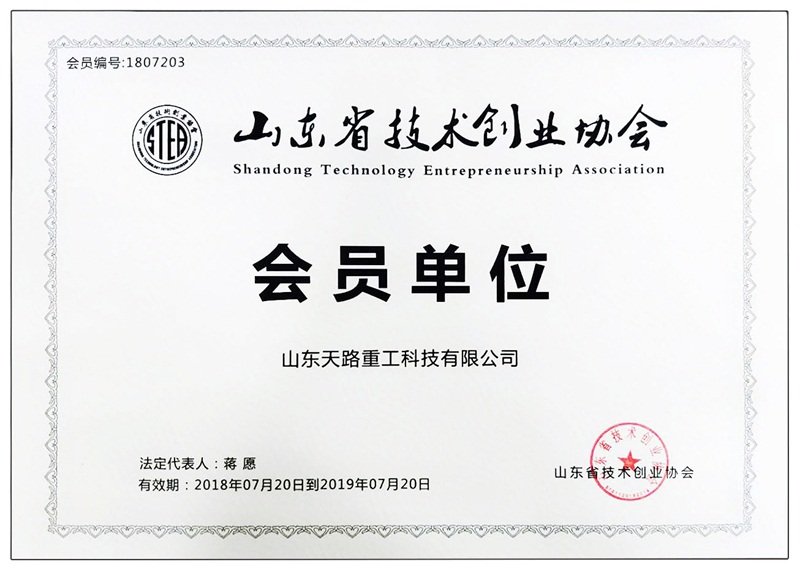 近日,經過嚴格的資料審核以及業(yè)績評估,天路重工被成功授予“山東省技術創(chuàng)業(yè)協(xié)會”會員證書,正式成為山東省技術創(chuàng)業(yè)協(xié)會的會員單位。