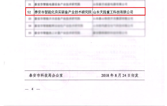 近日,根據(jù)《泰安市產(chǎn)業(yè)技術(shù)研究院管理暫行辦法》,經(jīng)評審,論證和公示,山東天路重工科技有限公司達(dá)到泰安市產(chǎn)業(yè)技術(shù)研究院的認(rèn)定條件,認(rèn)定為“泰安市產(chǎn)業(yè)技術(shù)研究院”。