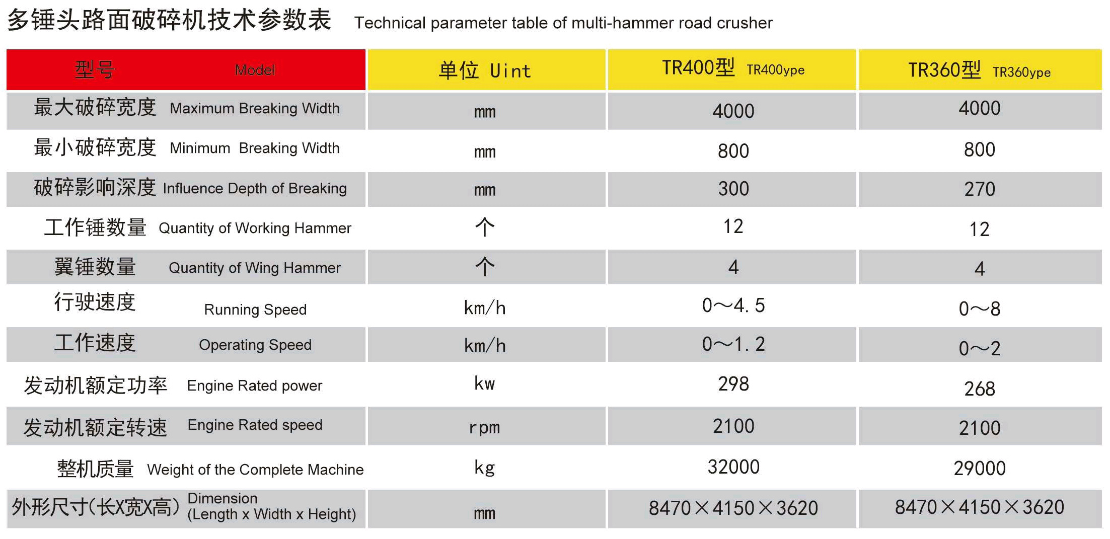 TR400/ TR360型多錘頭破碎機是水泥混凝土路面進行碎石化技術的專用機械,對舊水泥路面打碎后,水泥路面顆粒由上而下逐漸增大,經碾壓后,上部顆粒形成平整面,下部顆粒間形成嵌擠結構,再加鋪新的面層后,可有效強化路基。